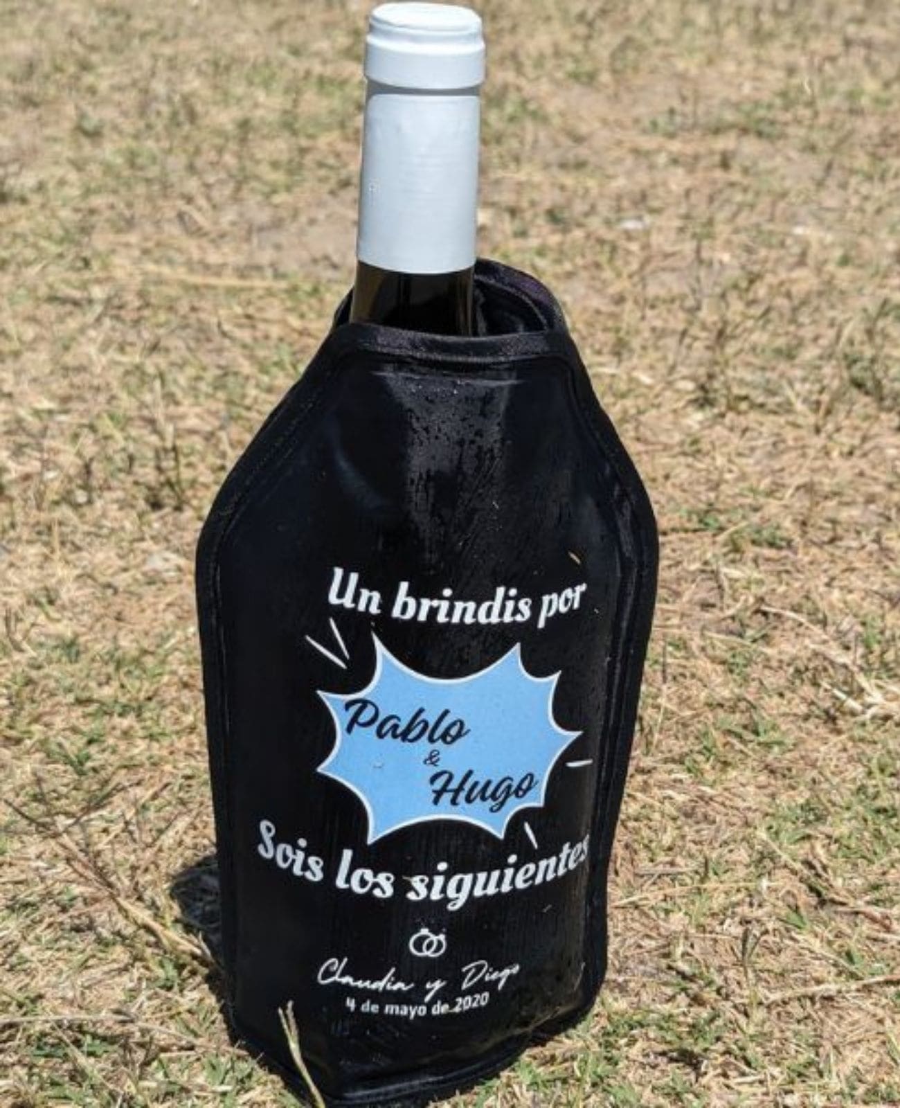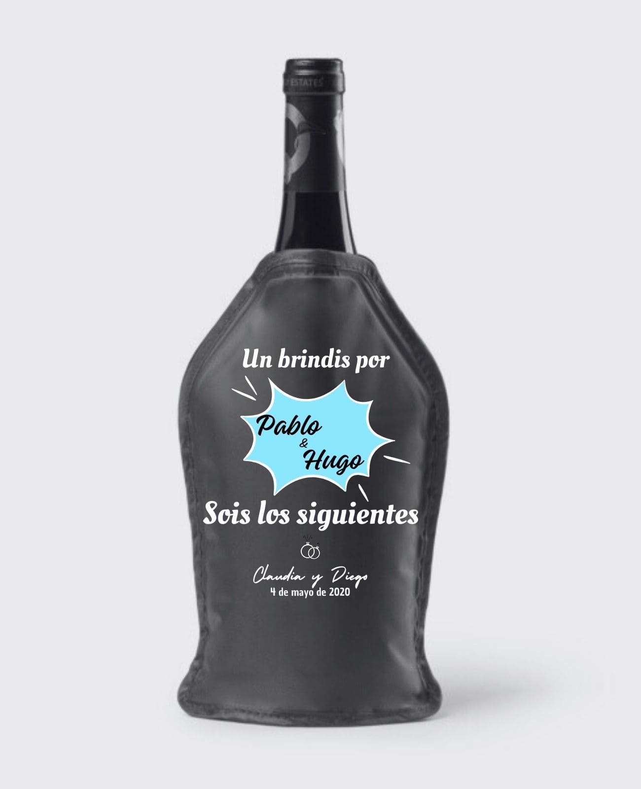 Con bandas elásticas en los laterales para adaptarlo a la botella y que le pueda transferir bien el frío al estar en contacto con el largo del cristal.